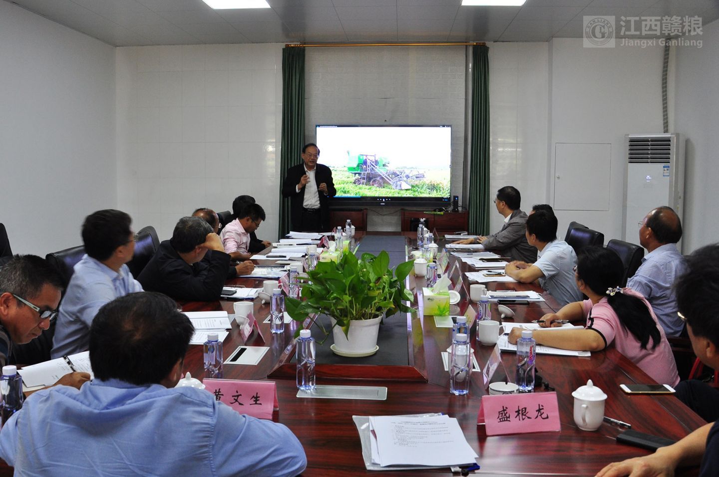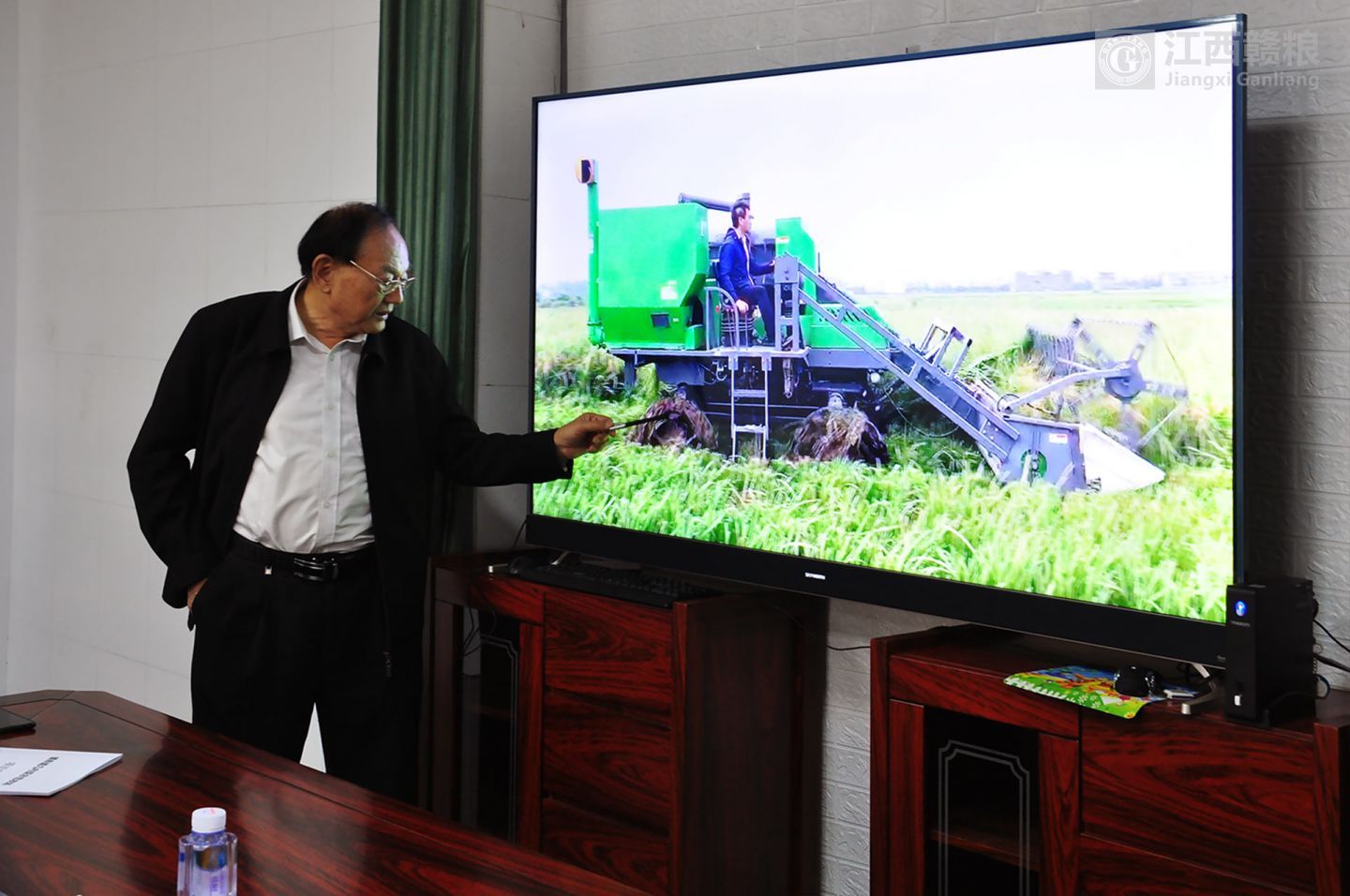 隨后,院士一行在贛糧公司院士工作站進(jìn)行水稻“優(yōu)質(zhì)品種+高產(chǎn)栽培技術(shù)+全程機(jī)械化”配套技術(shù)融合研討,院士工作站向院士、領(lǐng)導(dǎo)、專家一行詳細(xì)匯報(bào)了贛糧國內(nèi)外項(xiàng)目實(shí)施進(jìn)展情況。三位院士聽取匯報(bào)后,先后進(jìn)行了認(rèn)真指導(dǎo)。會(huì)上,羅錫文院士展示了團(tuán)隊(duì)最新研究的第三代輪式水稻收割機(jī),對(duì)解決再生稻第一季機(jī)收碾壓?jiǎn)栴}有很好的效果。