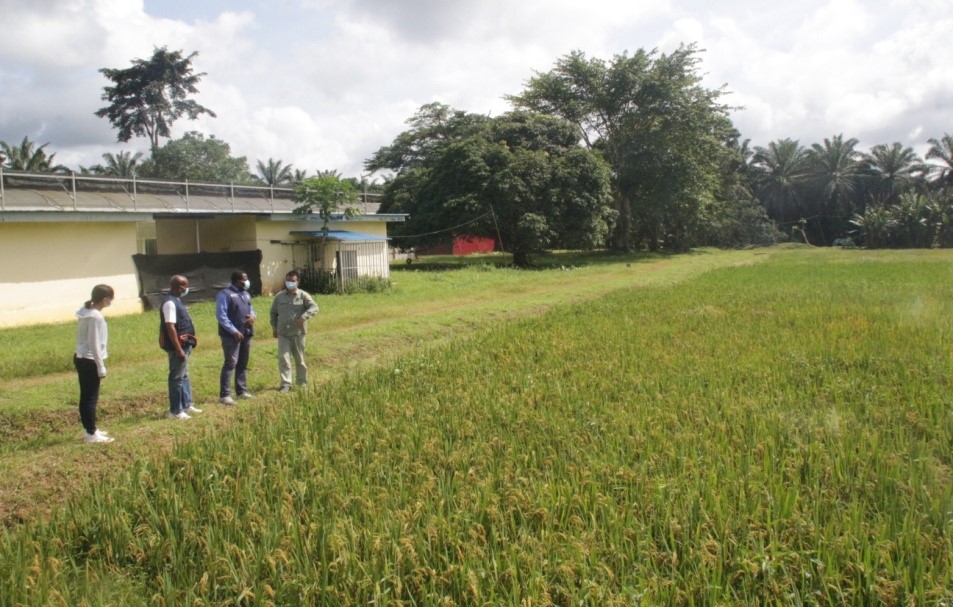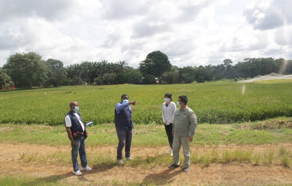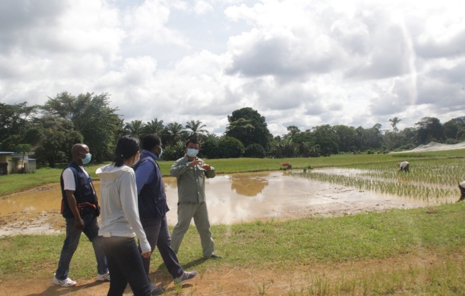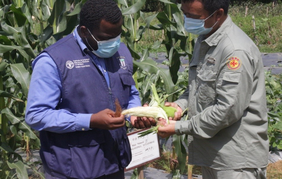 2021年5月12日,聯(lián)合國糧農(nóng)組織(FAO)駐赤道幾內(nèi)亞大陸地區(qū)負(fù)責(zé)人胡利安先生到示范農(nóng)場進(jìn)行參觀,項(xiàng)目組在室外接待了胡利安先生一行,在羅玉生專家的陪同下,胡利安先生一行先后參觀了蔬菜大棚、水稻種植區(qū)和玉米種植區(qū)等。