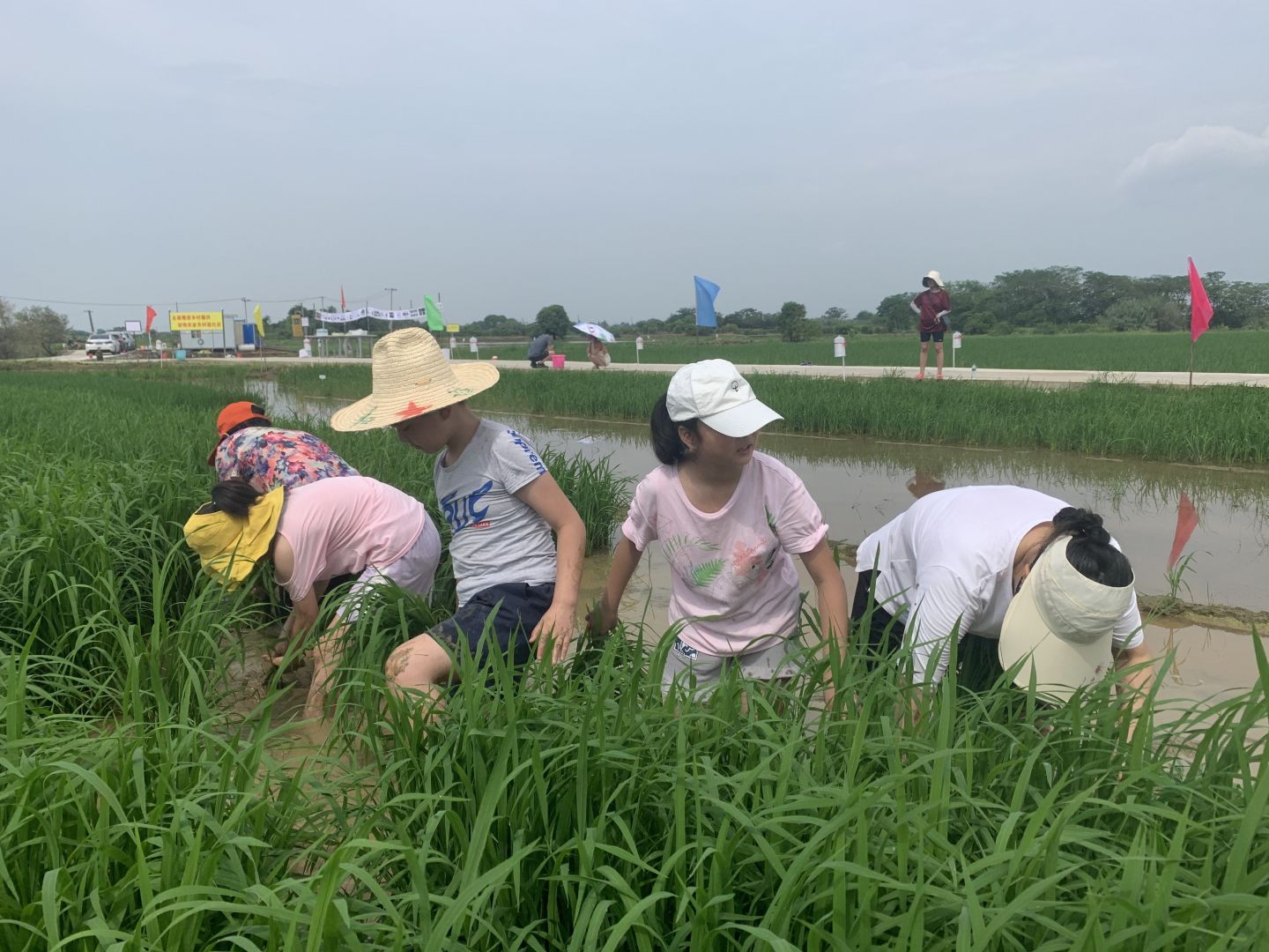 上午9點整,活動開始,先由江西贛糧院士工作站藍海軍副主任向大家介紹基地情況,然后帶著大家來到科普區(qū),一一介紹了正在展示的各種顏色和形狀的30多種特種稻,并隆重介紹了基地工作人員以稻為筆,“繪制”的黨旗等彩色稻圖案為百年建黨節(jié)獻禮。然后,來到基地正在實施的“無人農(nóng)場”項目區(qū),介紹了無人農(nóng)場的運行過程和智慧農(nóng)業(yè)實施應用情況。隨后藍海軍副主任拿起了一個基地正在使用的生物植保器具“二化螟性誘器”為大家講解它的捕蟲原理。接著,又通過圖片給大家上了一節(jié)關于我國農(nóng)耕文化發(fā)展過程的科普教育課。最后,孩子們在基地場長劉平洲的帶領下整齊有序地排成隊伍來到一塊水田旁,像快樂的小鴨子一樣一個個走下田去,手沾土,腳踩泥,與農(nóng)田親密接觸。在技術人員的指導下他們先完成拔秧的工序,然后把自己拔的秧又一棵棵整齊有序地栽插到屬于自己的小田塊里。“株距大約18厘米,行距大約20厘米。左手握秧,右手捏兩株左右秧苗往泥里插,不能太深也不能太淺......”不等劉平洲場長“崗前培訓”完,孩子們迫不及待地插起田來。認真程度不亞于農(nóng)民伯伯。不一會兒就完成了一大半。個別小朋友在水田中寸步難行,甚至一度重心失衡,一屁股坐在水田里,惹得大家發(fā)出一陣陣愉快的笑聲。
