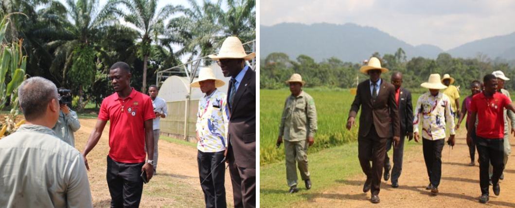 2019年12月20日上午,在圣誕佳節(jié)來臨之際,赤道幾內(nèi)亞農(nóng)業(yè)、畜牧、森林和環(huán)境部部長阿卡波攜當?shù)靥厣撂禺a(chǎn)慰問示范農(nóng)場水稻專家陳大洲和項目組。農(nóng)林部官員、涅方市各級領(lǐng)導(dǎo)、巴塔及涅方電視臺新聞記者等陪同。
